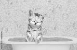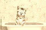Cute kitten with pieces of cucumber on it eyes and with cream on it face takes the bath at home