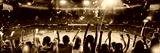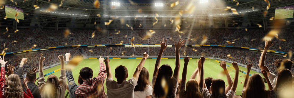 Sport match. Back view of football fans cheering favorite soccer team at crowded stadium at evening time. Open air game. Concept of competition, leisure time, emotions, live sport event