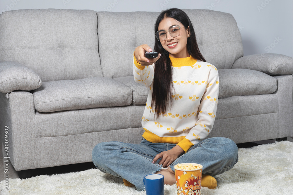 Beautiful Asian woman holding TV remote control Smiling happily while watching TV in the living room at home.