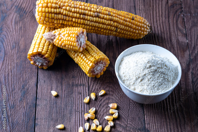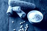 Cornmeal in a cup next to corn cobs on a wooden table.