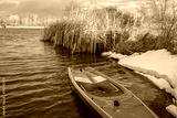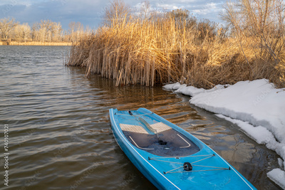 touring stand up paddleboard with a safety leash on a shore of lake in northern Colorado, winter or early spring scenery with some snow