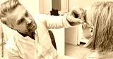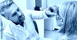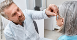 Audiologist installing a hearing aid on the ear of a middle-aged woman in a hearing clinic. Deafness Treatment, hearing solutions