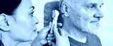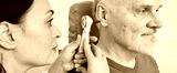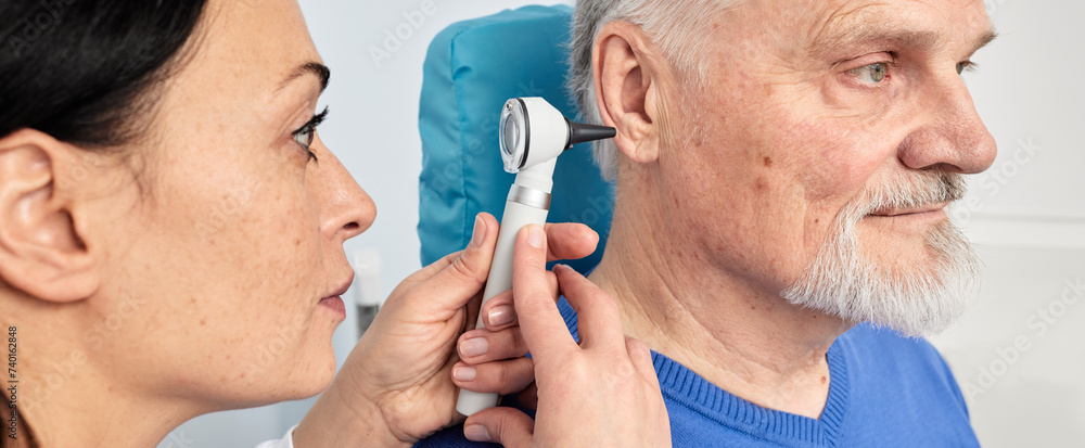 Hearing test for mature people, otoscopy. Otolaryngologist doctor checking senior man's ear using otoscope or auriscope at medical center