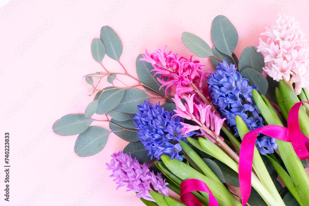 wedding or mothers day background, bouquet of Hyacinth flowers over plain pink background