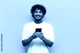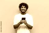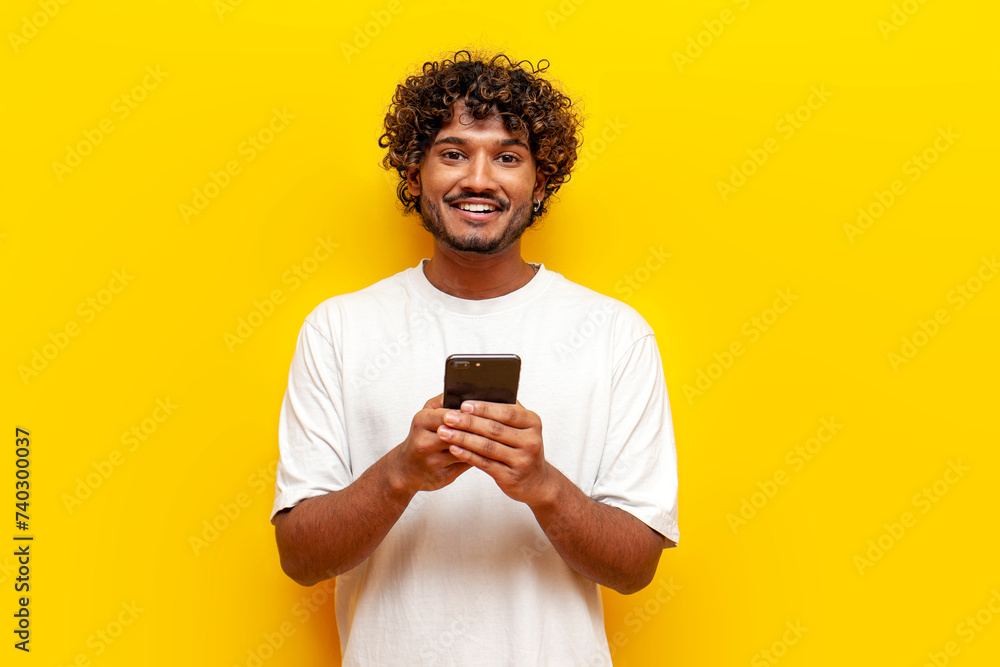 curly indian man is using smartphone and smiling on yellow isolated background, guy in white t-shirt is typing on the phone online and looking at the camera