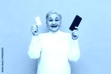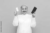 old grandmother in white sweater shows smartphone and bank card and buys online on yellow isolated background, an elderly pensioner woman holds a mobile and a credit card and smiles
