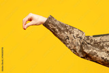 hand of Ukrainian soldier in camouflage military uniform pixel holds pinch and sprinkles on yellow isolated background, military hand shows and adds
