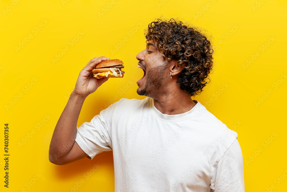 young indian man eating a big tasty burger with his mouth wide open on a yellow isolated background, curly guy student eating and advertising fast food