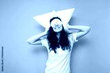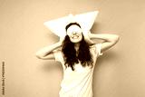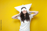 young girl in sleep mask and pajamas sleeps hugging pillow on yellow background, healthy sleep concept