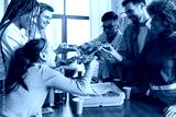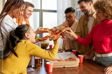 multiracial group of young people at a house party ordered pizza and beer