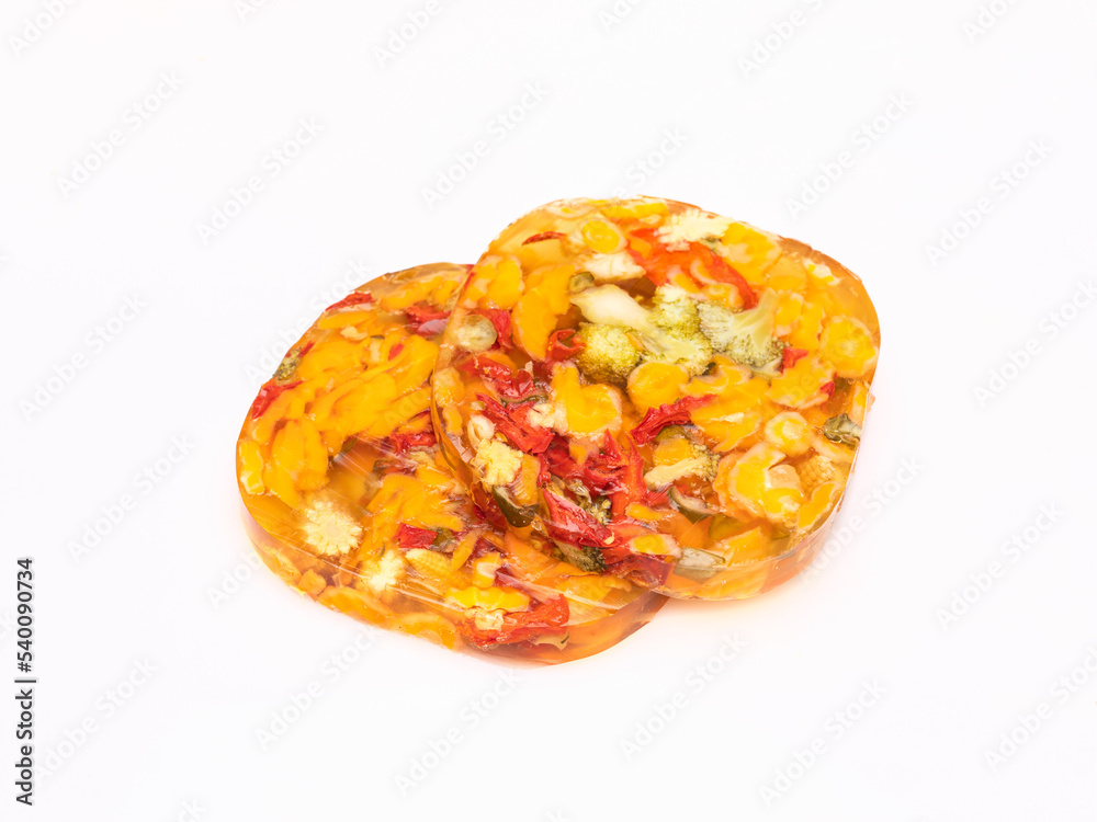 Close up portrait of beautiful blonde model wearing flowing red silk toga gown and crown, dressed as ancient mythological fantasy goddess. Graceful elegant pose isolated on studio background.