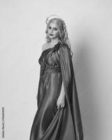 Close up portrait of beautiful blonde model wearing flowing red silk toga gown and crown, dressed as ancient mythological fantasy goddess. Graceful elegant pose isolated on studio background.