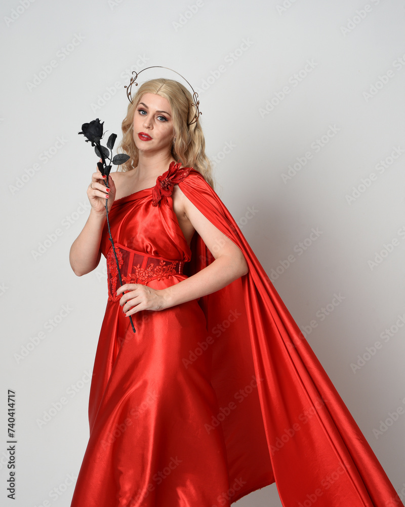 Close up portrait of beautiful blonde model wearing flowing red silk toga gown and crown, dressed as ancient mythological fantasy goddess. holding a rose flower isolated studio background.
