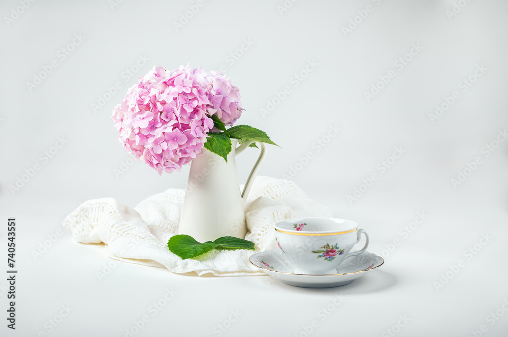Still life with a blooming bouquet of pink hydrangea in a vase and a fine porcelain cup of coffee on a white background