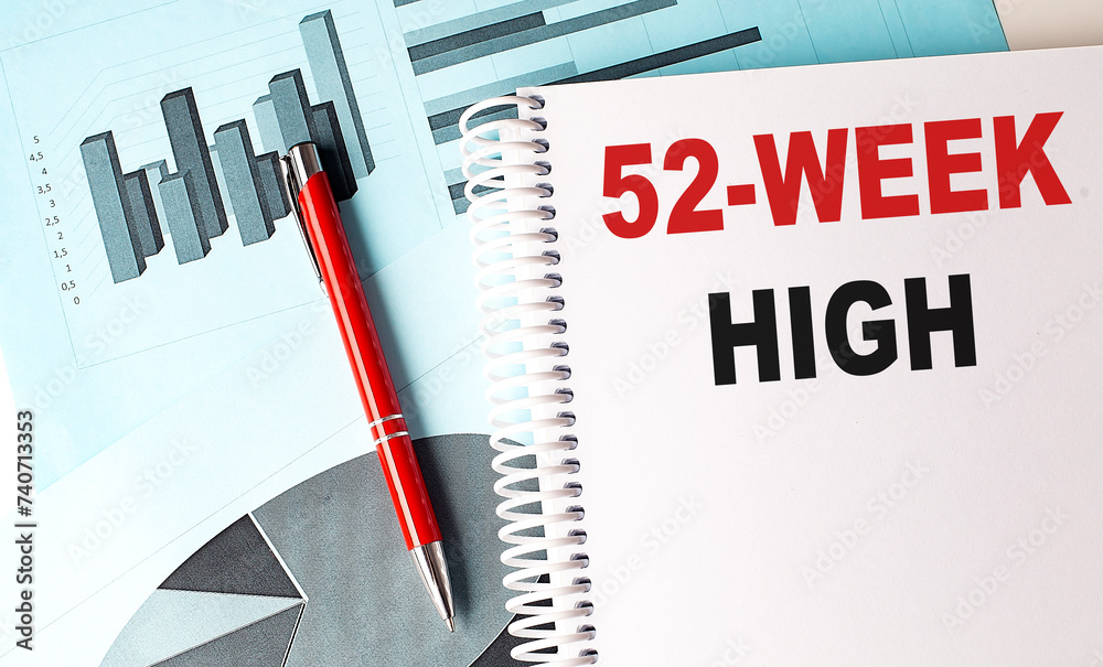 52 WEEK HIGH text on a notebook with pen on a chart background