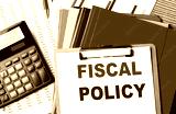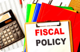 FISCAL POLICY text written on paper clipboard with chart and calculator