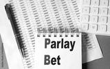 PARLAY BET text on notebook with pen, calculator and chart on grey background