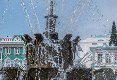 Transparent jets of water in a fountain in the park in summer.