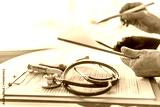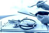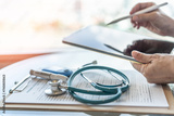 Medical equipment, diabetes checking blood sugar level test, glucometer, stethoscope and clipboard on doctor's work desk background with patient health record exam or diagnosis for health care.