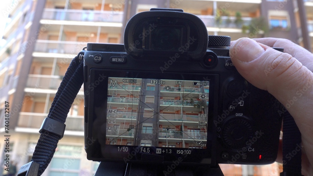 Man photographer taking pictures indoor in living room - real estate home photography and professional video to sell the house apartment - interior design and home staging - exterior building photo