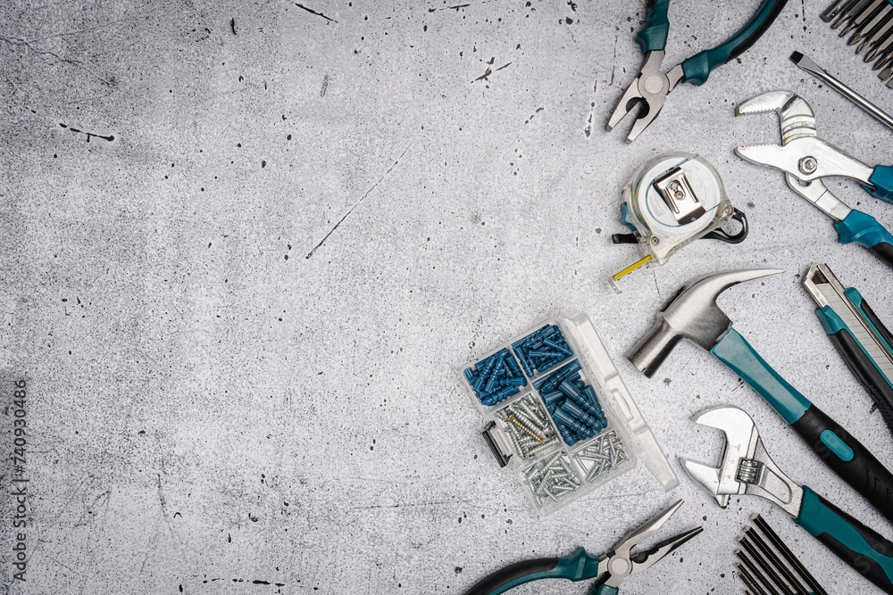 Assorted Hand Tools Laid Out on concrete background, top view with space for text