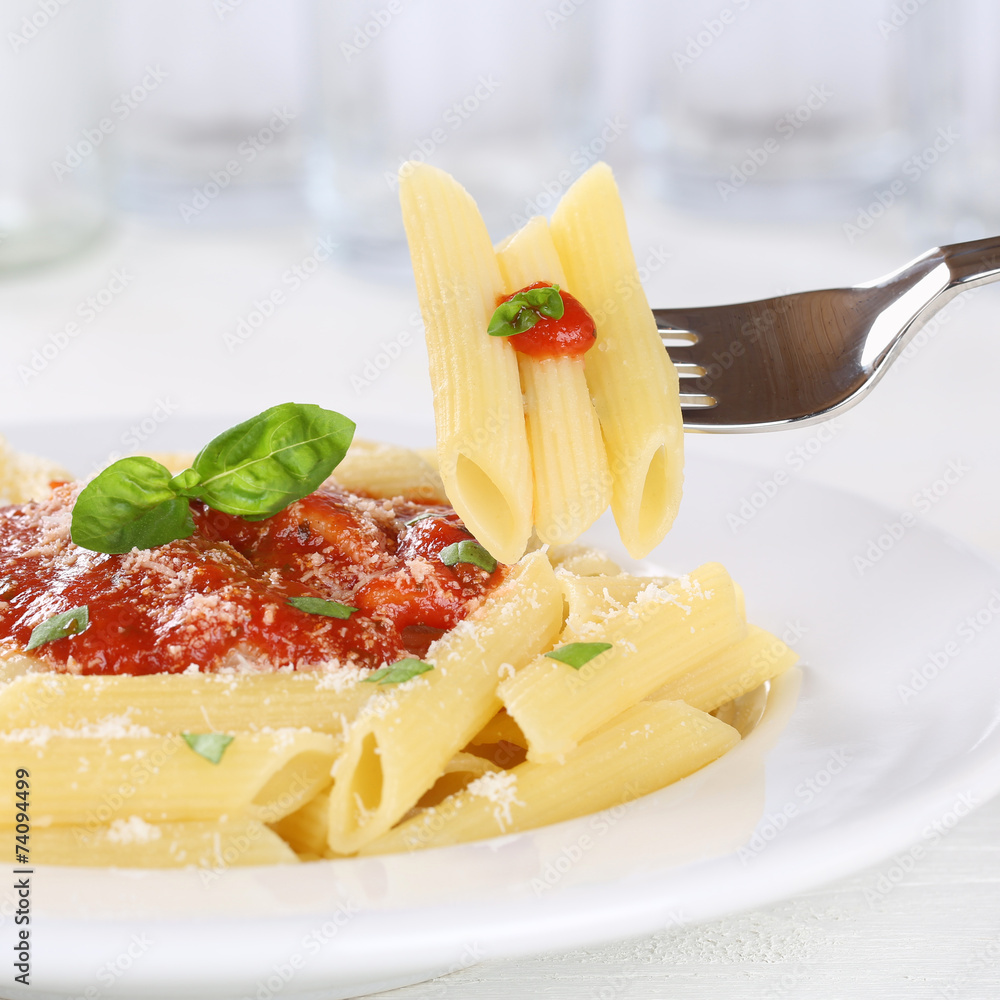Pasta Rigate Napoli essen mit Tomaten Sauce auf Gabel