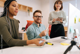 Happy multiethnic colleagues employees cooperating in office talking working together at workplace. Diverse young startup business team coworkers discussing planning computer business project.