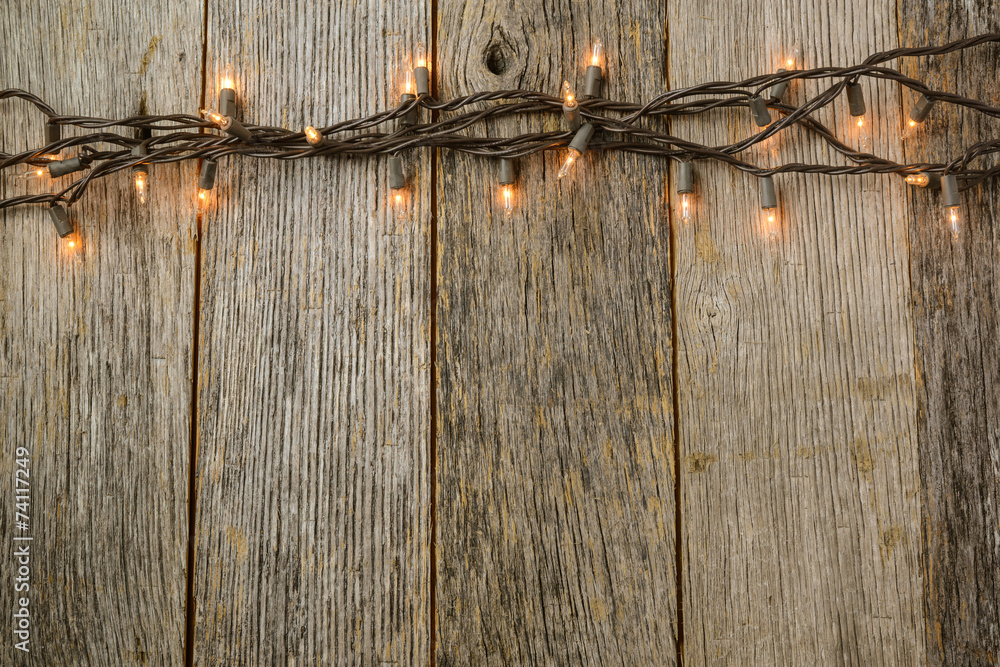 Whiite Christmas Tree Lights with Rustic Wood Background