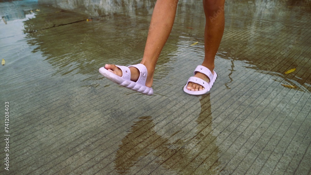 children's feet wearing slippers stepping on puddles of water
