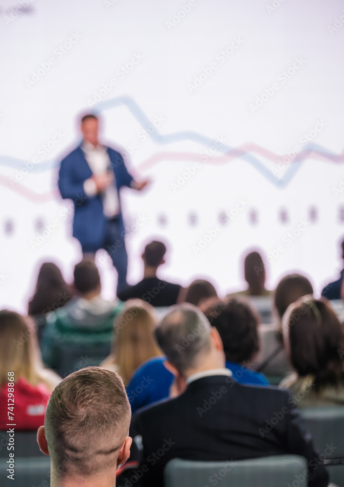 Blurred speaker at business workshop with attentive audience and data chart in background. Corporate event scene.