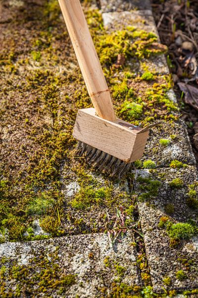 Removing and scratching moss out of paving stones, cleaning terrace and patio