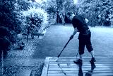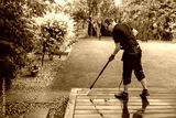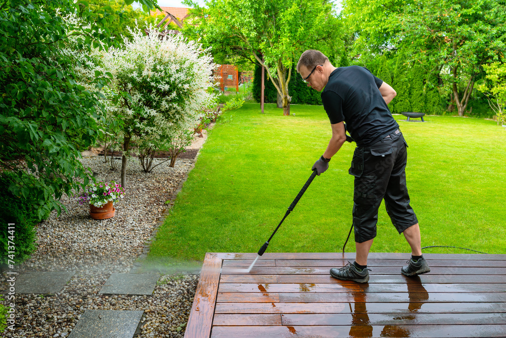 man cleaning terrace with a power washer - high water pressure cleaner on wooden terrace surface