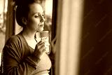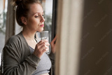 Anxious and thoughtful woman standing next to the window