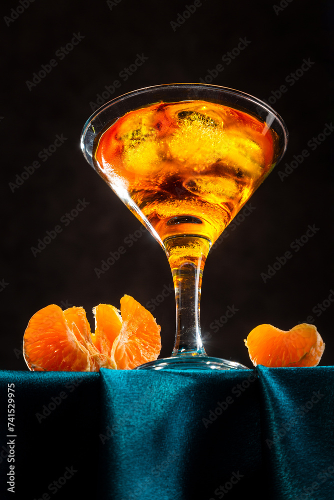 Citrus drink with tangerines and ice on a dark background. Bottom view.