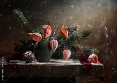 Winter still life with a bouquet of snow-covered spruce branches, physalis and pine cones