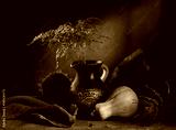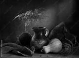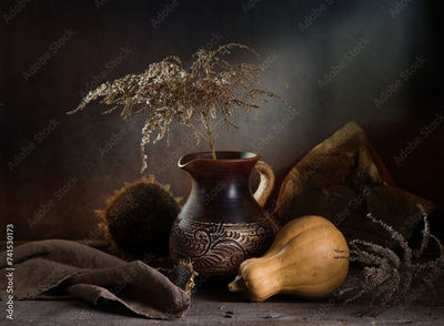 Modern still life with a pumpkin and a dry branch in a clay jug on a dark background