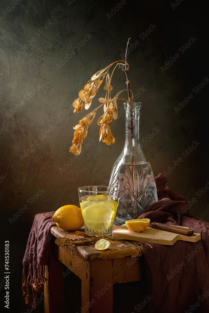 Still life with a glass of water with lemon and a maple branch on a dark background. A healthy drink