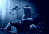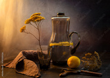 Still life with a glass jug of water with lemon and dried flower on a dark background. A healthy drink
