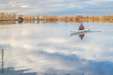 senior male paddler is paddling a decked expedition canoe on a calm lake in northern Colorado, winter scenery without snow