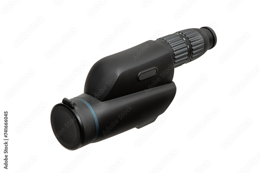 Modern spyglass. Long-range observation device. Monocular isolate on a white back