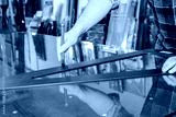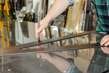 A glazier cuts glass in a glass factory, cutting thick glass, Professional glass equipment, Concept, glass panes for shower cabins, showcases, glass buildings