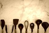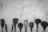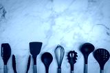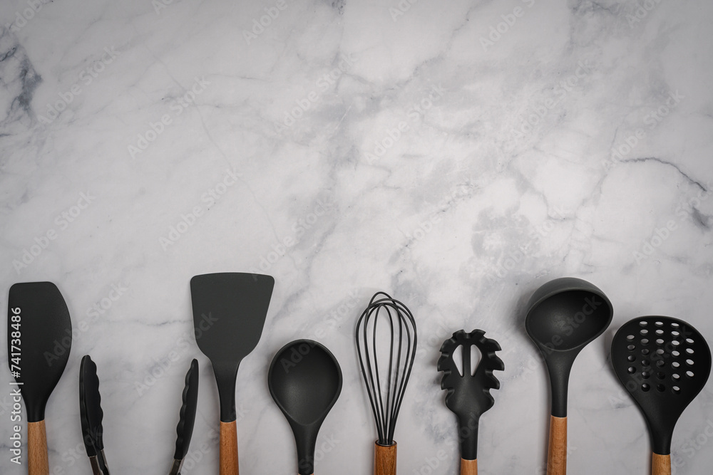 Kitchen silicone utensils for cooking tools on white marble background, top view, flat lay. Kitchenware collection with copy space. Cooking background.