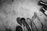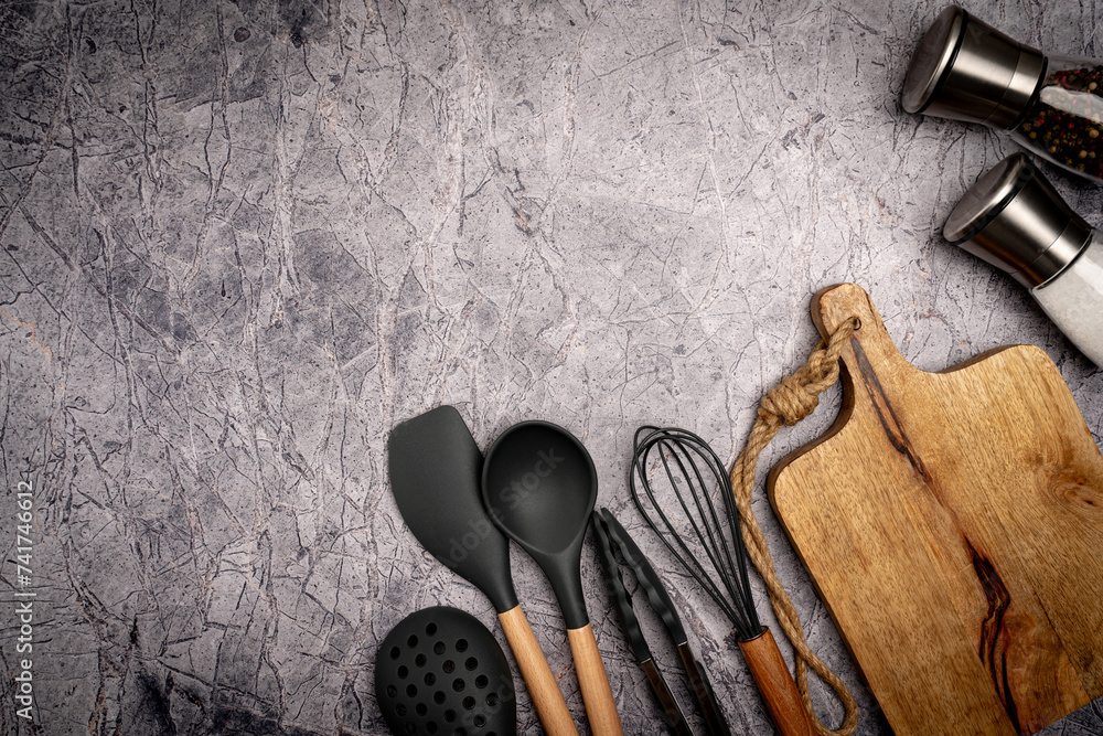 Kitchen silicone utensils for cooking tools on concrete background, top view, flat lay. Kitchenware collection with copy space. Cooking background.