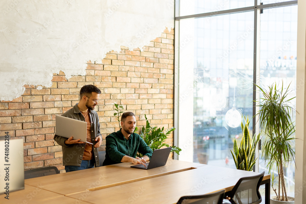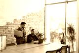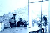 Collaboration in Motion, Professionals Working Together in a Modern Brick-Walled Office