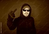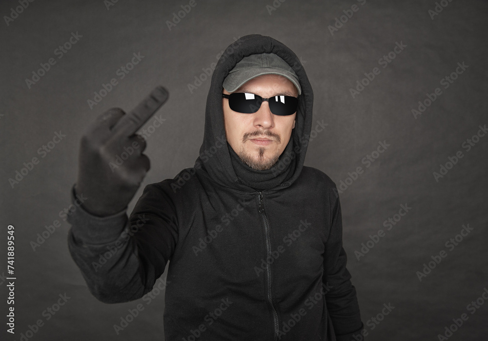 Man in the black hoody with hood wearing sunglasses showing middle finger