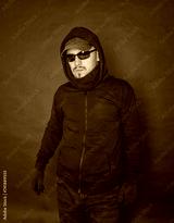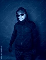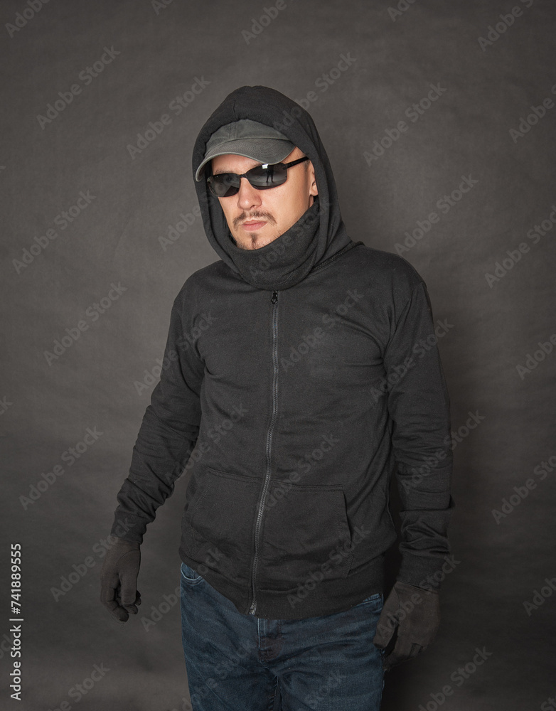 Unrecognizable man in the black hoody with hood and wearing hat and sunglasses