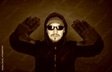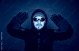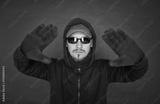 Unrecognizable man in the black hoody with hood and wearing hat and sunglasses with hands up stop gesture