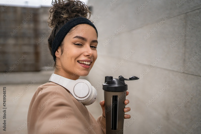 One young woman caucasian female hold supplement shaker outdoor in day