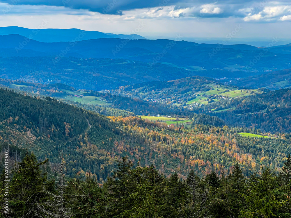Beskid Slaski mountains in Poland, view from the peak to the lower regions. Wisla area
