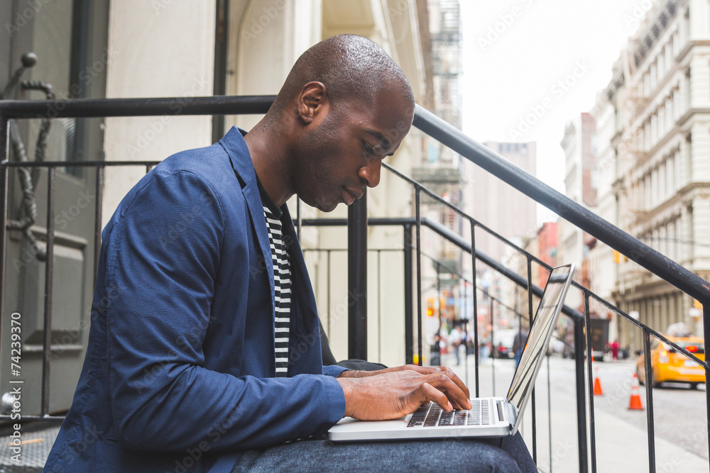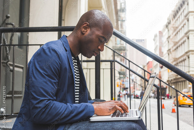 Black Guy Using Notebook in New York